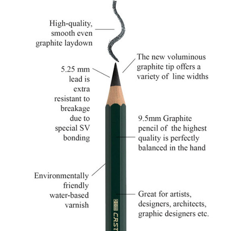 Faber-Castell offers studio-quality graphite sketch pencils for art students and aspiring artists. These pencils are made with finely ground graphite and clay giving the artist a smooth, consistent marks. Graphite pencils are available in 8 degrees of lead hardness including 4H, 2H, H, HB, B, 2B, 4B, 6B.