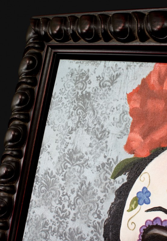 This Day of the Dead Style Artwork is framed in a rich, dark wood frame. This piece of art is rich with details and color, an overall magnificent piece. Pairing it with this dark, contrasting frame; they complement each other beautifully.