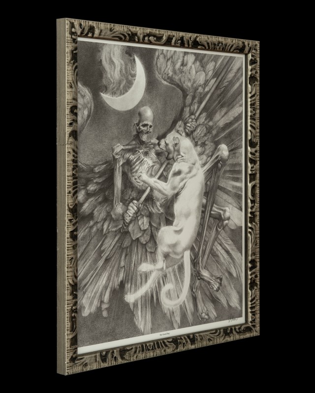 This graphite drawing by award-winning illustrator Allen Williams is displayed in a unique picture frame. The frame compliments graphite drawing in both texture and style.