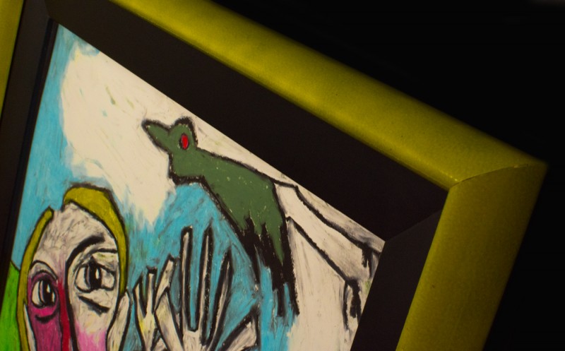 This pastel painting is framed in a vibrant green frame to coordinate with the artworks strong colors. A black inner frame creates separation from the green frame and the artwork, to allow for a space for the artwork to "live". As is often done with pastel paintings in picture frames, a space is made between the painting and the glass in order to ensure the artwork does not become damaged.