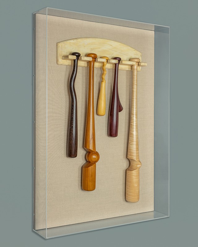 These wooden bat sculptures are mounted to a solid backing, which was lined with a linen mat board, then enclosed in plexiglass. The bat rack is part of the sculpture.