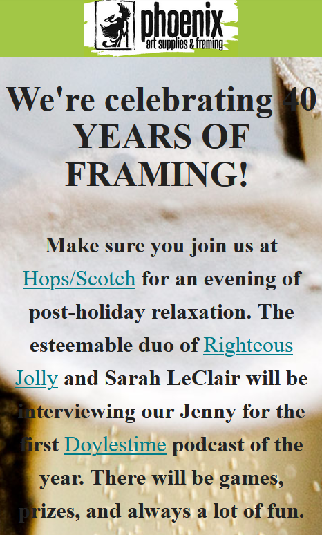 There will be games, prizes, and always a lot of fun!  Plus, everyone in attendance will receive a coupon for $ 40.00 off a future custom framing order!